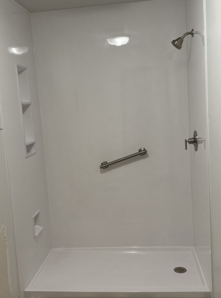 We offer acrylic and Onyx wall panel systems. Both are seamless, grout-free, and designed for easy cleaning. We help you choose during the free consultation.